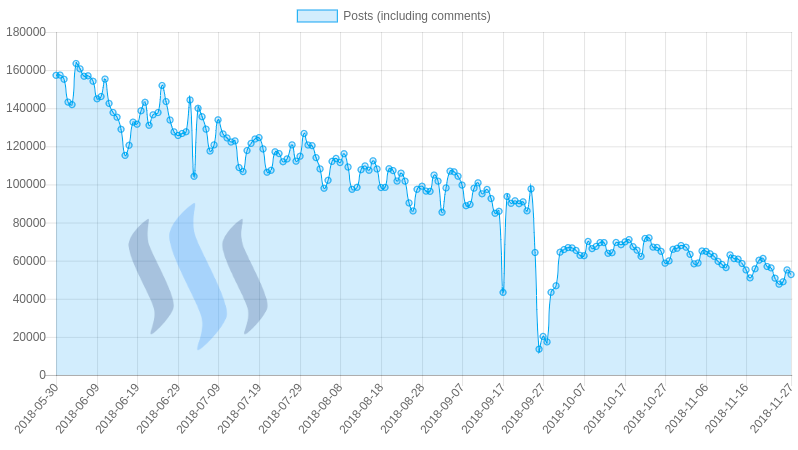 A user by the name of @pneguinpablo kept great records of steem's activity which is where I found the next chart. Although posts were declining after the peak, we can see that in May 2018, there were 160,000 posts per day, but by November 2018, there were only ~50,000, still a large figure even by today's standards.