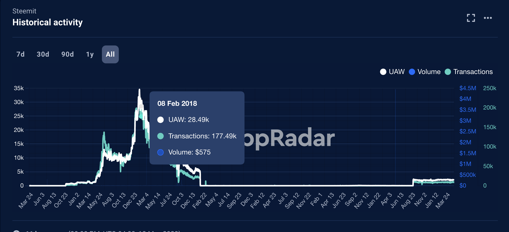 From dApp Radar, we saw the peak number of users at 35,000 DAU. Practically all of the transaction activity came from posting, commenting and sharing because STEEM predated DeFi. These figures are an amazing feat even by today's standards. Activity quickly grew from  October 2017 to Feb 2018 reaching a nose bleeding 250,000 real transactions per day.