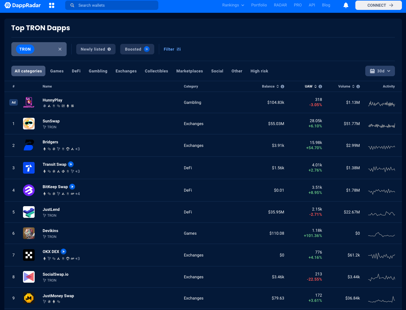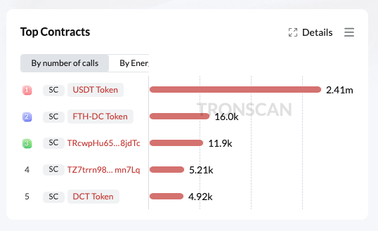 While this seems impressive, nothing seems to corroborate these stats. Below is a screen shot from dApp radar which reports that the top TRON dApps are all DeFi and Exchanges, but we can't even tally up 100,000 DAUs. Many of the reported 2.4M transactions from token terminal do not show up on dApp radar. It's likely that they are transactions produced by bots that are running MEV scripts or acting as market makers. Obviously some data is being fed to token terminal that doesn't come from a dApp. What do your senses tell you? Let's dig further.