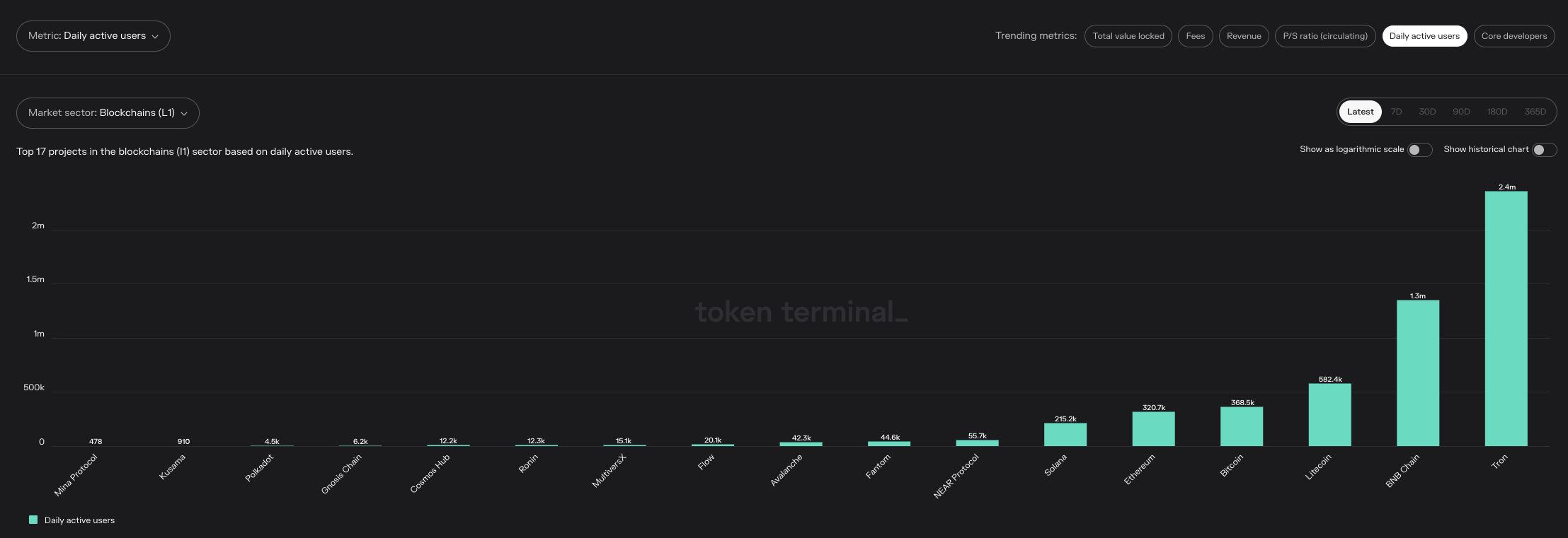 Below is a chart of Daily Active Users (DAU) as reported by token terminal. To the far right is the infamous TRON blockchain which shows 7.5x more DAU than ETH.