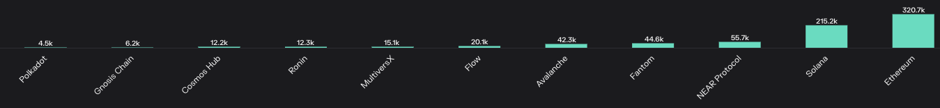 We're used to seeing web2 apps like instagram, fb or twitter which have millions of DAUs. However, once you get past ETH, the DAU begins to dramatically drop off. You only need 55k DAU to be in the top 3 blockchains. Only 5k to be in the top 10.